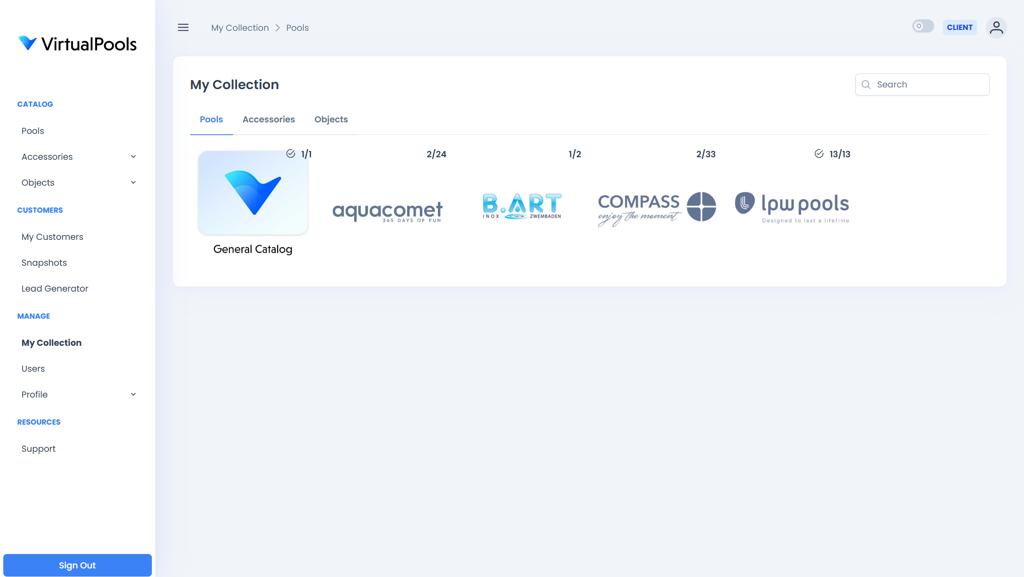The My Collection section contains all products and suppliers that are currently active in your 3D configurator. This library determines what you can access and present when designing projects or creating quotes.