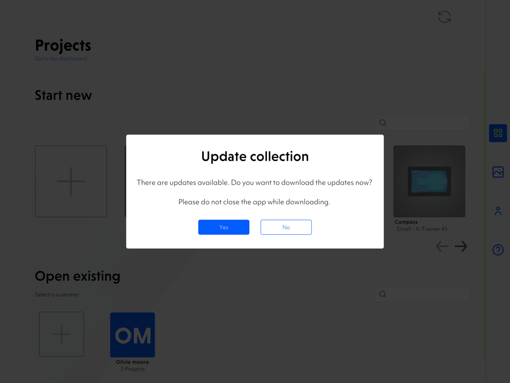 After making changes on the dashboard, your iPad app needs to sync in order to display the updated collection. Open the VirtualPools app on your iPad Pro. When a collection update is detected, a pop-up will appear prompting you to download the latest version. Tap Yes to start the update.